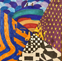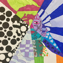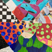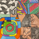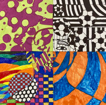 This project has many levels of art process. A headshot is taken of the artist, then they are asked to create a four-paneled self portrait that contains these elements: pattern, complimentary color, black and white and personal narrative. The result is a dynamic combination of art elements that describe the artist while offering a visual feast for the eyes.
